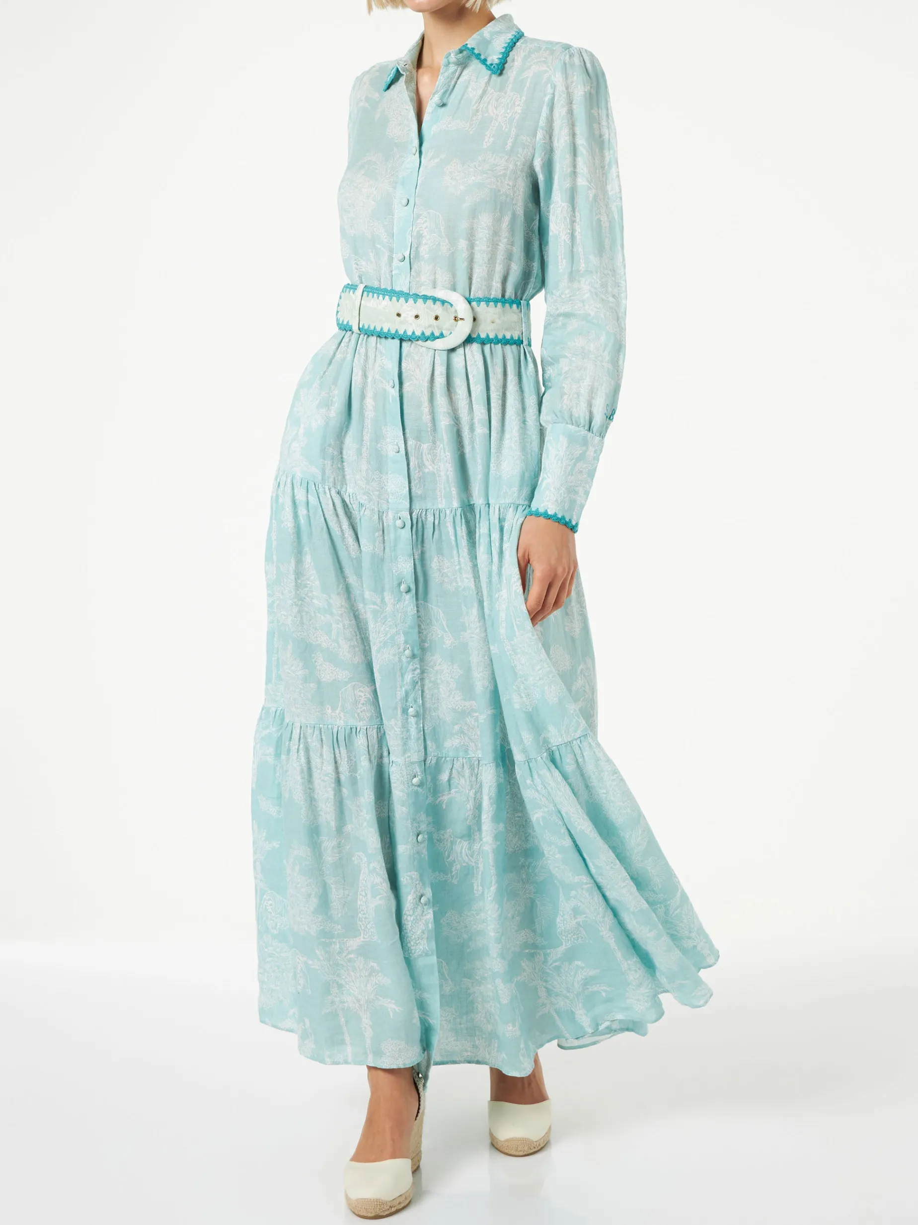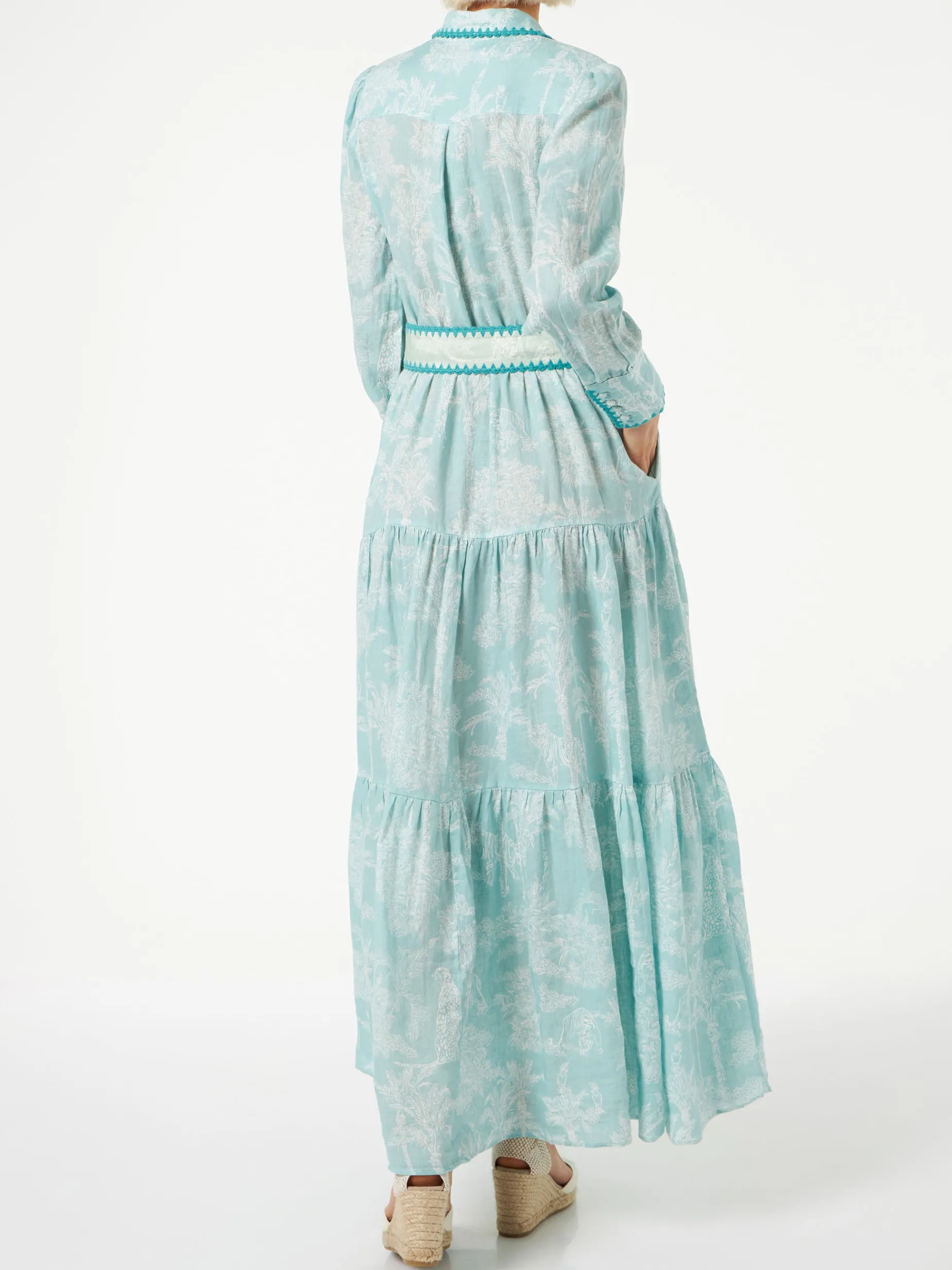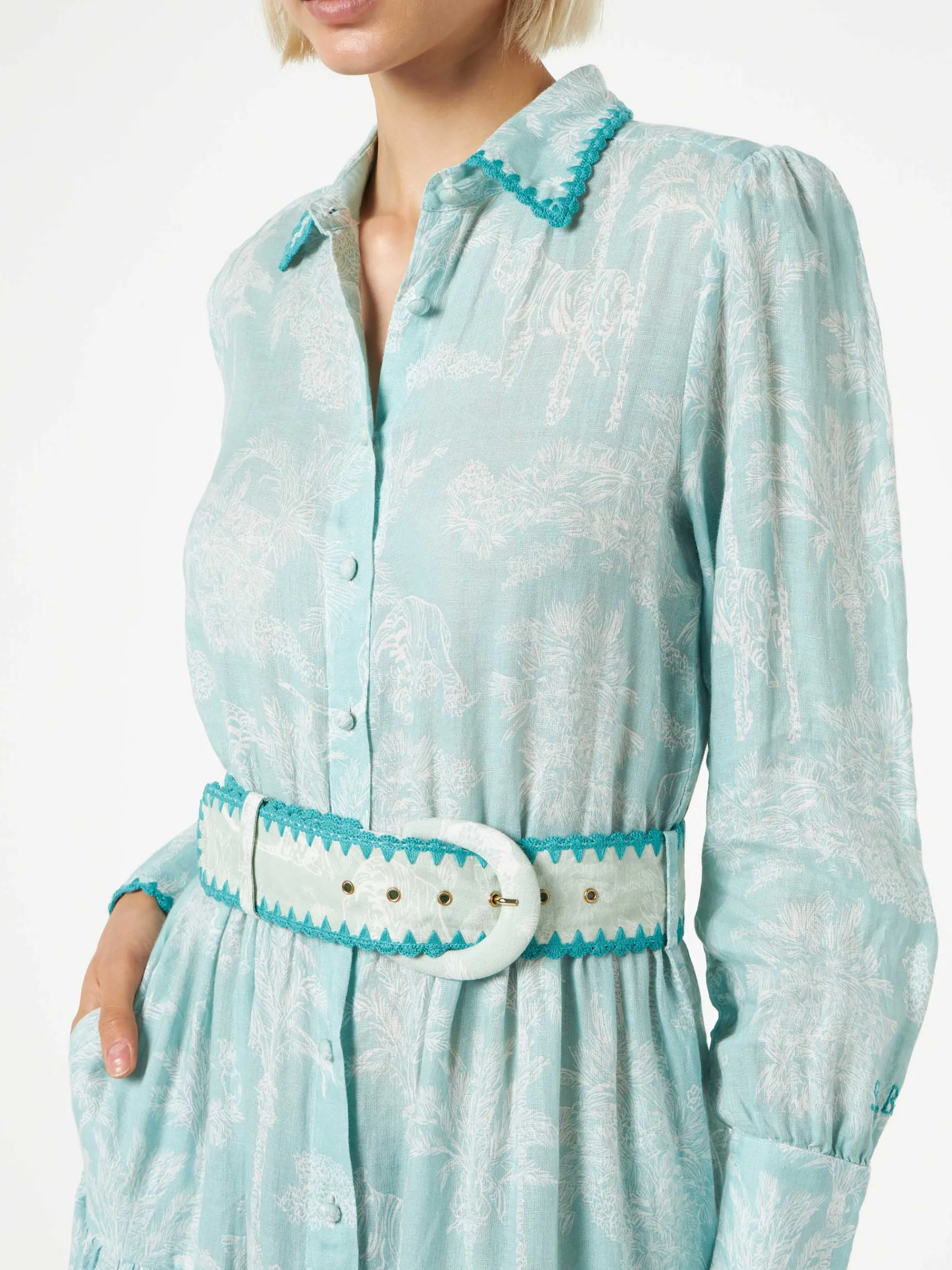 Piping ricamato su maniche, collo e cintura