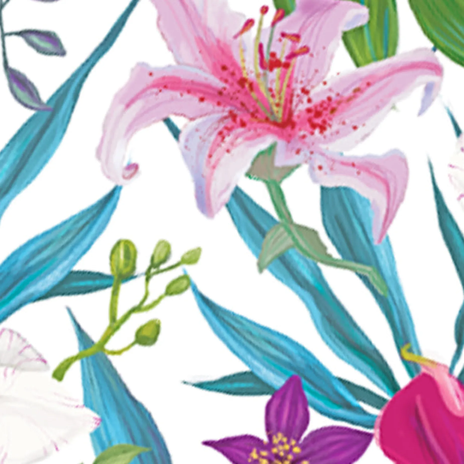 Stampa rosa, viola, celeste e verde su fondo bianco