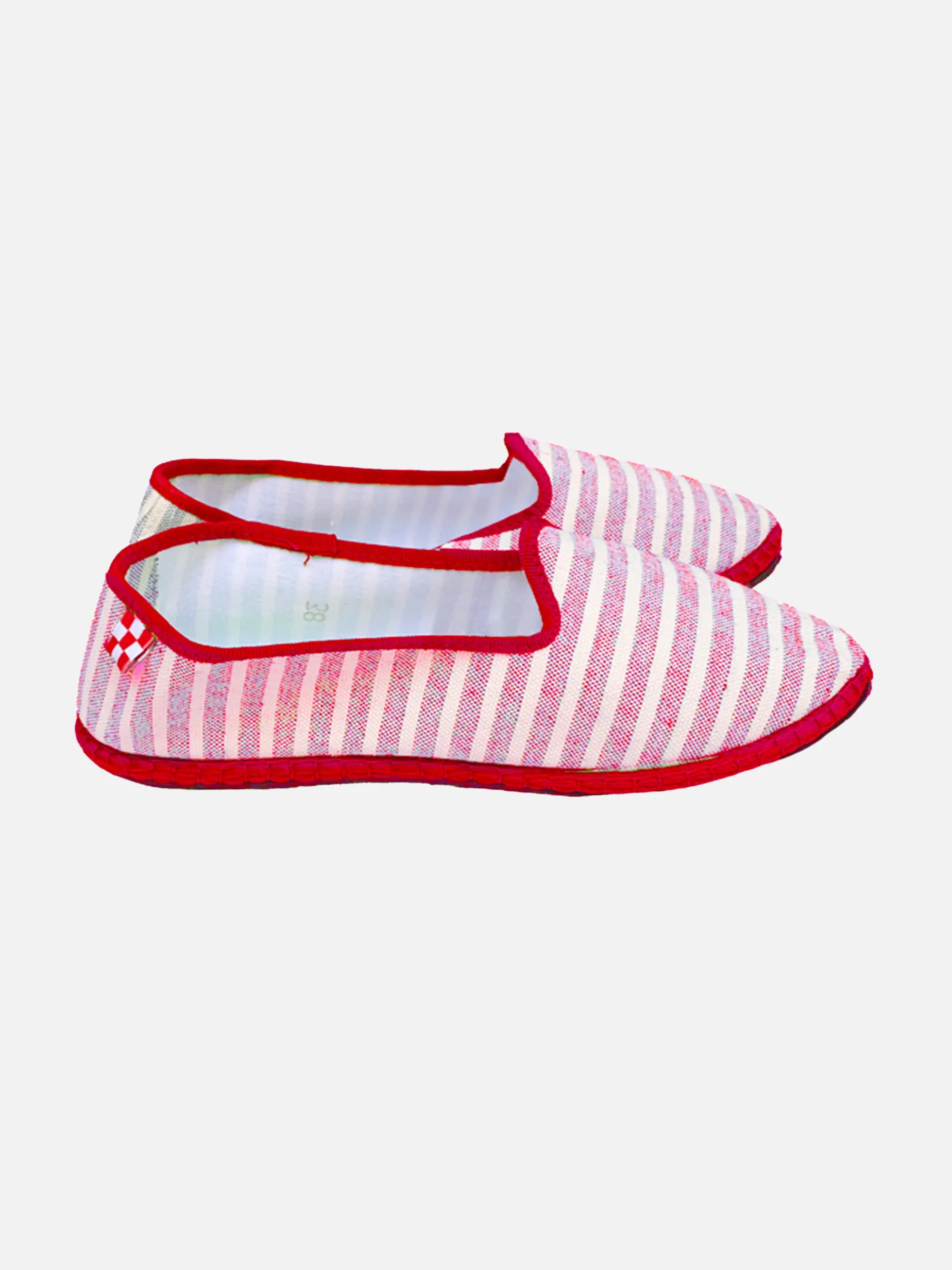 Pantofole rosse a righe sottili “Friulane”, artigianali made in Friuli Venezia Giulia, perfette per il tuo tempo libero. Tomaia in tela naturale, suola in gomma. Fatto in casa in Italia