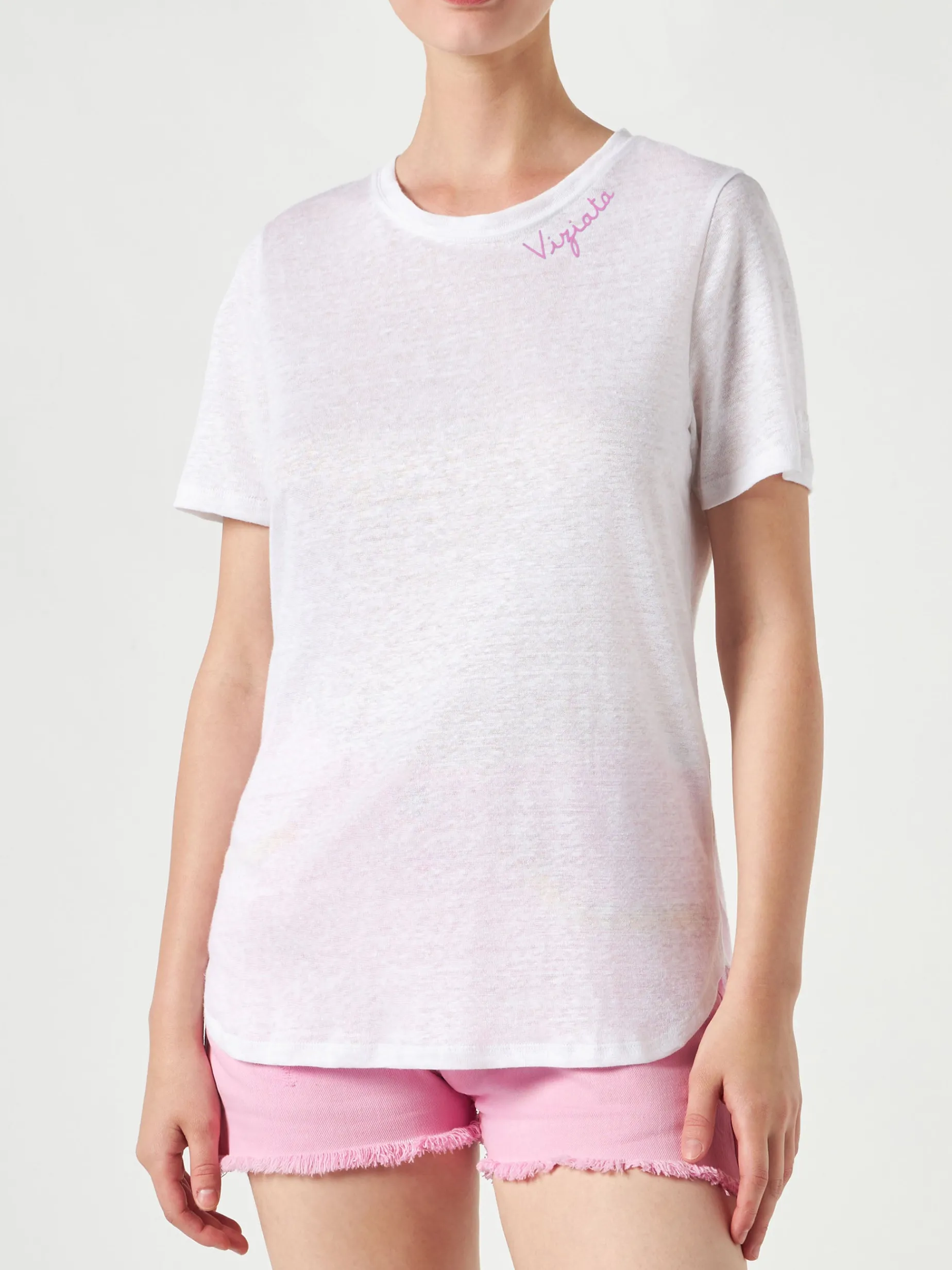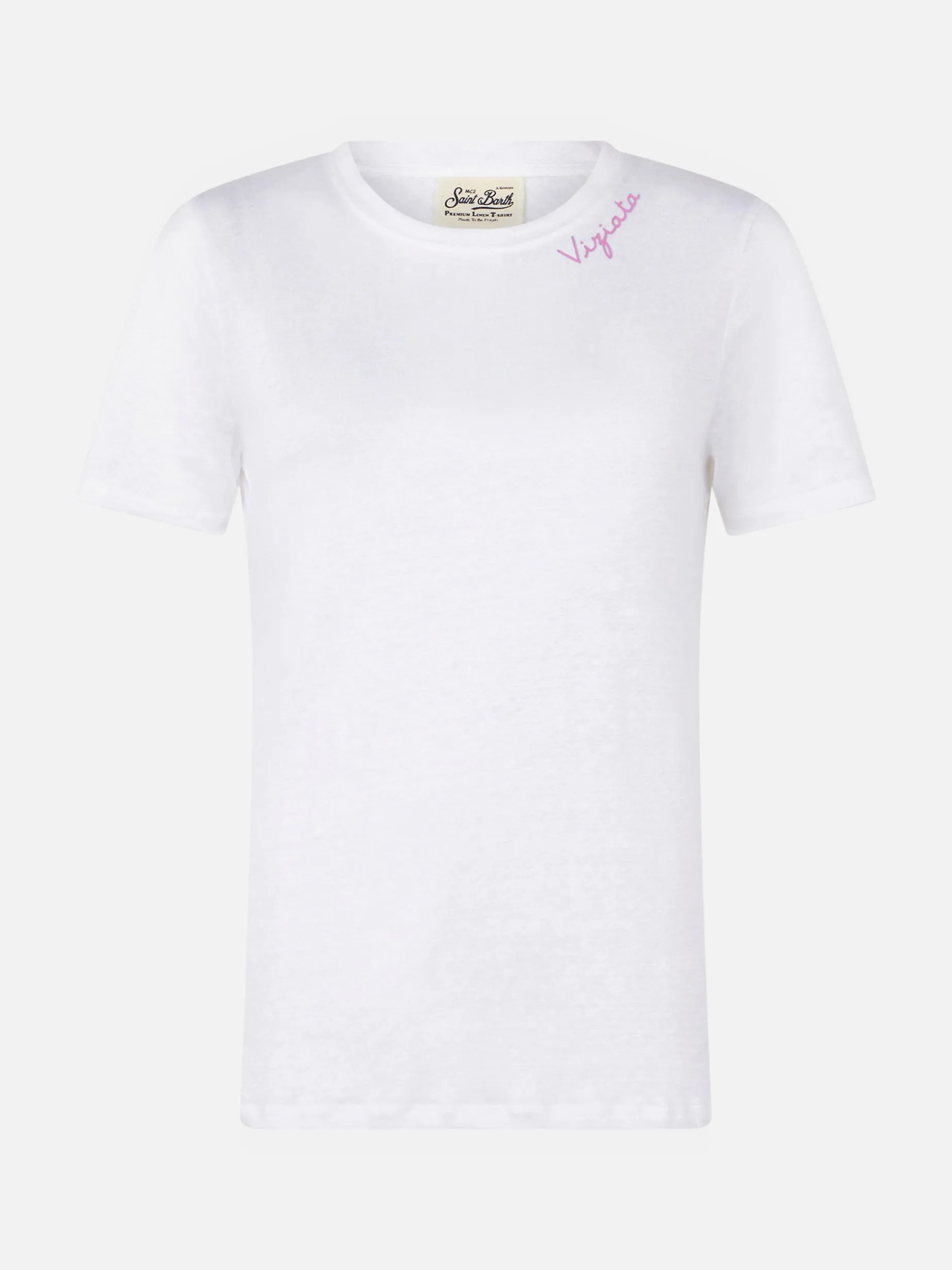 morbido lino, maniche corte pieghettate, stile St. Barth. Composizione 100% jersey di lino.